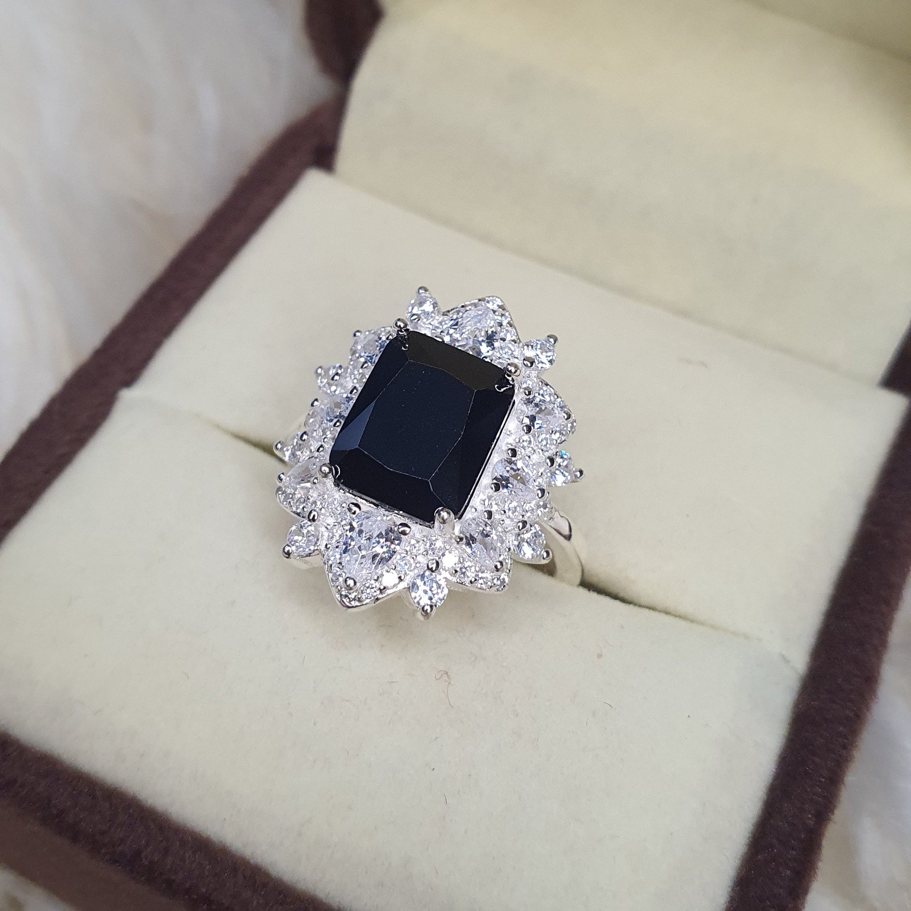 This exquisite 925 Silver Styling halo-style ring features a striking rectangular black gemstone at its center, set in a secure four-prong mount. A radiant halo of brilliant white diamonds surrounds the centerpiece, creating a luxurious starburst effect. Crafted in polished white gold (or silver, if applicable), the band tapers elegantly for a comfortable fit. Perfect for evening wear, special occasions, or as a statement piece.