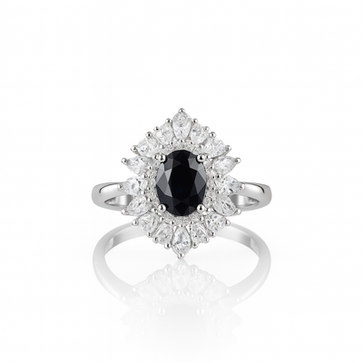 Elevate your evening elegance with the Midnight Radiance Ring, a masterfully crafted statement piece that combines the deep mystique of a black sapphire with the timeless sparkle of a diamond halo. At its center rests an exquisitely faceted oval black sapphire, hand‑selected for its rich, velvety hue. Surrounding the sapphire, a floral halo of brilliant round‑cut diamonds catches the light from every angle, lending the design an air of refined glamour. The gently tapered band—crafted in sterling silver 925 and plated in rhodium for lasting brilliance—ensures both comfort and durability, making this ring equally perfect for a special occasion or to add a touch of luxury to your everyday wardrobe.
